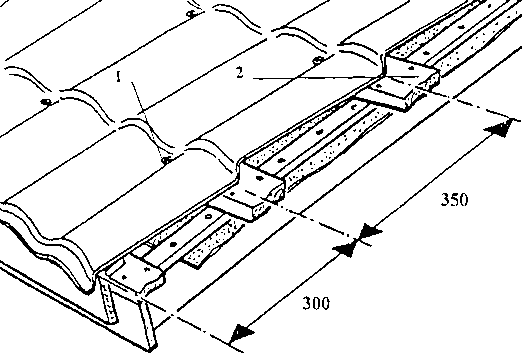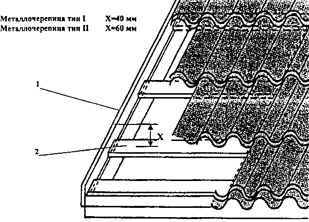 2.9. Обрешетка под листы металлочерепицы выполняется из антисептированных досок сечением а х 100 мм (а - высота доски, определяется проектом; при шаге стропильных конструкций 700-900 мм а=32 мм) с расстоянием по осям (рис.5):
