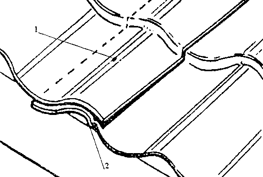 Рис.13. Установка винтов в гофрированные складки металлочерепицы 1 - винт самонарезающий; 2 - обрещетка