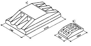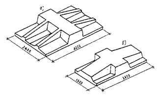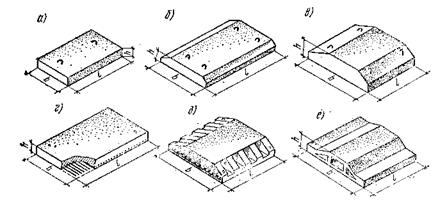 Рис. 4.7. Типы сборных блок-подушек: а,б,в – блок-подушки массового строительства; г – блок-подушка с предварительно напряженной арматурой; д – то же, с облегченными консолями; е – то же, с горизонтальными пустотами.