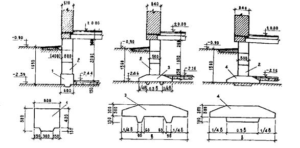 Рис. 4.10. Ленточные сборные фундаменты: 1 – бетонный ребристый блок; 2 – типовые блоки ФБС 24.5; 3 – плита ребристая; 4- плита длиной 1,2 м и шириной 800 мм.