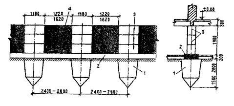 Рис. 4.11. Сборно-монолитные стены подвалов: 1 – фундаменты в вытрамбованных котлованах; 2- монолитный пояс; 3 – стеновые бетонные блоки; 4 – монолитные участки.