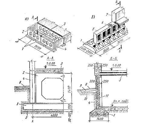 Рис.4.12. Конструкции облегченных ленточных фундаментов: а – с применением безраскосных железобетонных ферм; б из крупных панелей; 1 – фундаментная блок-подушка; 2- железобетонная ферма; 3 – плиты перекрытий; 4 – цокольная панель; 5 – панель-стенка; 6 – место сварки панелей; 7 – стена; 8 – отмостка; 9 – бетон; 10 – глтняная подстилка; 11 – утеплитель.
