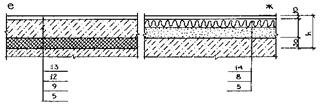 Рис. 6.15. Детали конструкций полов: Л - примыкание к стенам и перегородкам; К - сопряжения в дверных проемах; 1- плинтус деревянный; 2 - звукоизоляционная прокладка; 3 - гвоздь; 4 - деревянная прокладка; доска; 6 – цементно-песчаный раствор; 7 - прокладочный рубероид; В - бетонная разделка; 9 - плинтус из цементно- песчаного раствора; 10- шпаклевка; И - асбестовый картон; 12 - штукатурка или облицовка керамической плиткой; 13 –плинтус из фасонной керамической плитки; 14 - гидроизоляция.