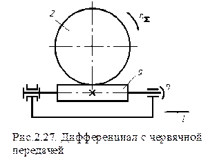 гайка получит суммарное продольное перемещение на величину, определяемую выражением L∑=n1t ±n2∙z1/z2∙t, где L∑ - величина суммарного перемещения маточной гайки; n1,n2 круговые частоты соответственно ходового винта и ходового вала; t – шаг ходового винта и ходового вала; t – шаг ходового винта. Дифференциал с червячной передачей. При вращении червяка и его поступательном перемещении (рис. 2.27) червячному колесу будет сообщено
