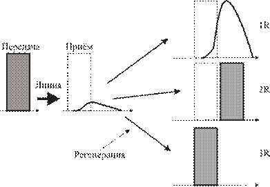 Из сигнала с фиксированной скоростью передачи выделяется составляющая тактовой частоты. После этого импульсы цифрового сигнала полностью восстанавливаются, т.е. выполняются функции регенерации типа 3R (рис.3.2): • восстановление амплитуды импульсов (Reamplification); • восстановление формы импульсов (Reshaping); • восстановление временных соотношений импульсов (Retiming).