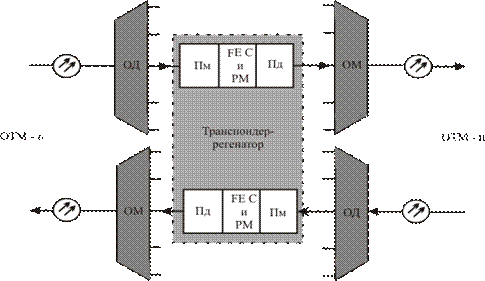 В состав транспондера входят компоненты, необходимые для поддержки одного направления передачи, а именно: - оптический приемник; - подсистема прямого исправления ошибок (FEC): - оптический передатчик. Обработка трафика в транспондерах осуществляется следующим образом. В транспондере ввода (рис.3.1) приемник клиентской части преобразует интерфейсный оптический сигнал в электрический сигнал внутреннего формата.