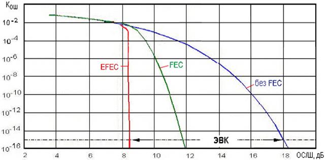 В усовершенствованной системе прямого исправления ошибок (E-FEC) используется стандартный алгоритм формирования биортогонального каскадного кода BCH, Рек. G.975.1. Система Е-FEC обладает большей исправляющей способностью (обеспечивает большую вероятность обнаружения и исправления ошибок), чем система FEC. В результате обеспечивается более высокая чувствительность оптического приемника (меньшее отношение оптический сигнал/шум - OSNR) при заданном коэффициенте ошибок, чем в режиме с FEC. Энергетический выигрыш системы передачи с 7% Е-FEC составляет порядка 9,5 дБ (рис.3.11). Это позволяет увеличить длину участка регенерации по сравнению с FEC. Информация о количестве исправленных ошибок может также использоваться для мониторинга эксплуатационных показателей оптического канала в соответствии с Рек. МСЭ G.826, G.828 и G.8201. При передаче сигналов SDH или GbE данные мониторинга эксплуатационных показателей обеспечиваются по стандартным параметрам ошибок для технологий SDH и GbE. Кроме того, на основе данных мониторинга эксплуатационных показателей может быть реализована автоматическая защита оптических каналов по схеме 1+1 на сетевом и аппаратном уровне. Время защитного переключения не превышает 10 мс.
