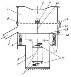 Рисунок 1.1.4. Вибрационный просеиватель МВП I-300: 1 - грузы-дебалансы; 2 - электродвигатель; 3 - основание; 4 - пружина; 5 - разгрузочный лоток; 6 - плоское сито; 7 - бункер; 8 - загрузочное окно; 9 - пружина; 10 - шпилька; 11 - защелка; 12 - корпус; 13 - днище; 14 - штырь; 15 - кронштейн; 16 - рабочий вал.