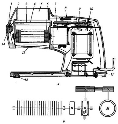 Мясорыхлители. На предприятиях общественного питания порционные куски мяса перед обжаркой подвергают разрыхлению, которое заключается в нанесении на поверхность порционных кусков надрезов, разрушающих соединительную ткань продукта, что способствует размягчению мяса, лучшему его прожариванию и уменьшению деформации кусков при кулинарной обработке. На ПОП применяются мясорыхлители МРМ – 15 и механизмы МРП – II – 1 и МР. Мясорыхлитель МРМ – 15 (рисунок 1.4.13 производительность Q = 1800 шт/ч) состоит из: корпуса 1; крышки 2; разъемной каретки 3; очистительных гребенок 4; загрузочного окна 5; ножевых блоков 6; основания 11; опоры 12; разгрузочного отверстия 13; привода (электродвигатель 9, клиноременная передача 8 и редуктор 7).
