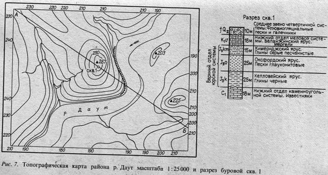 Необходимо выполнить следующее: составить геологическую карту района р. Даут в масштабе 1:25 ООО по данным буровой скв. 1. разрез которой приведен на рис. 7; построить геологический разрез по карте в северо-западном направлении по линии А - Б. Пояснения. Используя высотную отметку устья скважины, равную 265 м (определяемую по ее положению на карте с горизонталями), и мощности слоев, вычисляют высотные отметки геологических границ. Эти отметки находятся как разность отметки устья скважины и соответствующего значения мощности стратифицированных подразделений. При наличии этих данных, найдя соответствующие пункты на карте, легко провести нужные границы. которые могут совпадать с горизонталями или располагаться между ними. На участках карты с изображением обрывов слои указываются полосками шириной не менее I мм. При изображении аллювиальных отложений необходимо учитывать их общий наклон в сторону течения реки, приблизительно соответствующий продольному профилю речной долины. Таким образом, при горизонтальном залегании коренных пород аллювиальные отложения по мере продвижения от истоков к устью реки будут перекрывать все более древние подстилающие породы. При составлении геологической карты отметку поверхности аллювиальных отложений у северной и восточной рамок карты принять равной 185 м и у южной рамки-180 м. При построении геологического разреза следует правильно выбрать вертикальный масштаб, Учитывая, что мощность самого маломощного стратиграфического подразделения (в данном случае аллювиальных отложений) составляет 10 м и что минимальная ширина объекта, изображенного на разрезе, должна быть не менее 1 мм, получаем вертикальный масштаб разреза 1:10000, Для большей наглядности масштаб можно принять равным 1:5000,