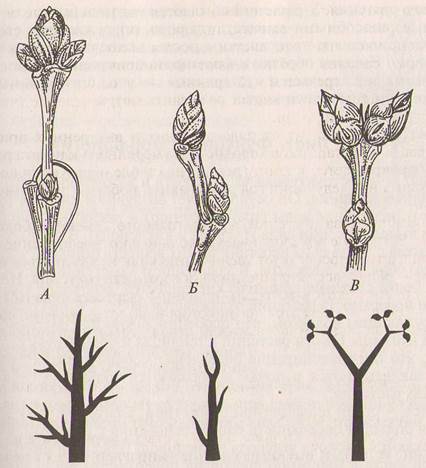 Рис. 1.6. Типы ветвления стебля: Показатель симподиального ветвления — пазушная почка (боковая), сидящая на верхушке побега. Она расположена в пазухе листа, и нри его опадении у основания почки сохраняется листовой рубец (липа, вязы, ивы). Ложноодихотомическое ветвление наблюдается у деревьев и кустарников с супротивными листьями. После отмирания верхушки годиличного побега вырастает не один побег замещения, а два супротипивных (клен, сирень). Способность к замещению отмерших или удаленных верхушечных побегов боковыми имеет большое биологическое значение, так как увеличивает жизнеспособность древесного растения. У растений со слаборазвитыми боковыми почками, не способными замещать главную, повреждение верхушки ствола приводит к прекращению роста и гибели всего растения (пальмы). Приемы обрезки и формирования кроны у плодовых и декоративных деревьев и кустарников связаны с возможным образованием симподиев за счет резервных почек.