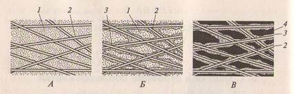 Рис. 5.2. Ультраструктура клеточной оболочки: А — оболочка без включений, состоящая из матрикса (1) и целлюлозного каркаса (2); Б — оболочка, инкрустированная лигнином (3); В — оболочка, инкрустиро-ванная лигнином, а также полифенолами или минеральными веществами (4).