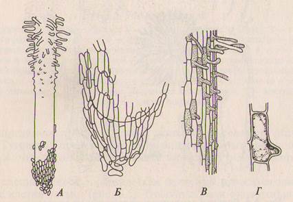 Рис. 6.7. Кончик корня традесканции (Tmdescantia): А — общий вид корневого чехлика, апекса и зоны всасывания, с корневыми волосками; Б — корневой чехлик и апекс; В — корневые волоски на разные стадиях развития; Г — трихобласт с примордием корневого волоска (трихобласты — клетки, образующие корневые волоски, обозначены точками). Корневые волоски. Данные образования представляют собой особый тип трихом покровной ткани корней — ризодермы (рис. 6.7). Это трубчатые живые выросты клеток ризодермы, поглощающие воду и разнообразные растворенные вещества, содержащиеся в почве. Они образуются в результате разрастания специализиро-ванных клеток ризодермы — трихобластов. Корневые волоски силь-но вакуолизированы, содержат ядро в пристенном слое цитоплазмы и легко проницаемую оболочку. Достигая в длину 1 — 2 мм, они многократно увеличивают поглощающую поверхность корня. Про-должительность их жизни составляет 15 — 20 дней.
