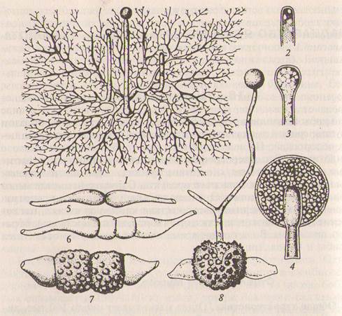 Царство Грибы Грибы появились 400 — 450 млн лет назад. Считается, что одни группы грибов произошли от жгутиковых простейших, другие— от водорослей. По некоторым чертам грибы имеют сходство с животными. Это гетеротрофный тип питания, присутствие хитина в клеточной стенке, отсутствие пластид, образование мочевины и гликогена как запасного продукта. Однако они имеют много общего и с растениями. Это неподвижный образ жизни, неограниченный верхушечный рост, жесткая клеточная стенка, поглощение питательных веществ из растворов, способность вырабатывать витамины. В настоящее время к этому царству относят Отдел Грибы и Отдел Лишайники. Общая характеристика. Отдел насчитывает около 100 тыс. видов. Это преимущественно обитатели суши, лишь немногие из них живут в воде. Тело грибов — грибница, или мицелий, состоит из ветвящихся нитей — гиф. Примитивно устроенные низшие грибы имеют неклеточный мицелий, гифы их без перегородок иногда представляют собой одну сильно расчлененную клетку (рис. 16.1) или имеют вид голого, лишенного оболочки комочка цитоплазмы. Тело большинства высших грибов состоит из гиф, разделенных перегородками на членики. Гифы мицелия могут сильно переплетаться, образуя ложную ткань — плектенхиму, или, соединяясь, образуют тяжи — ризоморфы. Клеточная стенка плотная, у низших грибов состоит из пектиновых веществ; у высших — из углеводов, близких к целлюлозе, со значительной примесью хитина, что делает стенку непроницаемой для многих веществ. Она часто пропитывается различными веществами, придающими ей прочность, и пигментами, окрашивающими ее в бурый, черный и другие цвета. В протопласте гиф выделяются цитоплазма, 1 — 2 или много мелких ядер, хорошо различимы рибосомы, митохондрии, аппарат Гольджи, эндоплазматическая сеть, пластид нет. Большинство грибов аэробы. Грибы — гетеротрофные организмы, большинство из них сапрофиты, но встречаются паразиты растений, животных и человека. От остальных гетеротрофных орга-низмов грибы отличаются внеклеточным перевариванием. Гифы выделяют вовне ферменты, которые катализируют расщепление крахмала и белков до глюкозы и аминокислот. Питание грибов происходит путем осмоса всей поверхностью мицелия, реже при помощи всасывающих ризоидов (плесневые грибы) или присо-сок-гаусторий у паразитов (ржавчинные, головневые грибы). Размножаются грибы вегетативно, собственно бесполым и поло-вым путями. Вегетативное размножение грибов происходит: 1) обрывками мицелия; 2) оидиями (артроспорами), которые образуются в рс-зультате распадения гиф на отдельное членики, дающие новый мицелий; 3) хламидоспорами, образующимися как оидии, но имеющими более твердую, часто темноокрашенную оболочку; 4) почкованием (на мицелии образуются отчленяющиеся боко-вые выросты).