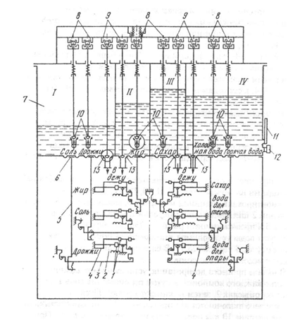 Дозировочные станции представляют собой комплекс дозаторов, смонтированных в единую установку, позволяющую производить поочередное или одновременное дозирование всех жидких компонентов. Конструктивно дозировочные станции подразделяют на две группы: периодического и непрерывного действия. К дозировочным станциям периодического действия относят станцию ВНИИХП-0-4, к станциям непрерывного действия - ВНИИХП -0-5, ВНИИХП-0-6, ШХДМ Дозировочная станция ВНИИХП -0-4 представленная на рисунке 40, предназначена для порционного дозирования воды, сахарного и солевого раствора, жидких дрожжей, растительного масла и растопленного жира в следующих пределах (кг): вода - 10-70; дрожжи 10-70, раствор соли - 3-24; сахарный раствор 3-24; жир 3-21. Дозировочная станция представляет собой бак 7, разделенный перегородками на четыре отсека I, II, Ш, IV. В днище каждого отсека вмонтирована резиновая мембрана 6, соединенная с весовым коромыслом 2 шкального типа с передвижными гирями 1 через стержень 5 и промежуточный рычаг 3. Для регулирования температуры воды установлены два терморегулятора 12 и для контроля ртутный термометр 11. В баке смонтировано шесть мембранно-весовых механизмов. В начале процесса дозирования, устанавливают заданное количество каждого компонента путем перемещения гирь 1 на весовых коромыслах 2, затем нажимают кнопку "Пуск" в результате чего включаются электромагниты 8, которые открывают впускные клапана 10 для подачи жидких компонентов в бак. При достижении заданного количества, мембраны под действием массы столба жидкости, прогибаясь, через стержень 5 приводят в движение весовые коромысла, которые контактами 4 выключают электромагниты 8 впускных клапанов 10, прекращая подачу.
