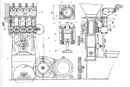 Рис. 40 Схема дозировочной станции ВНИИХП-0-4 Для выпуска отмеренной дозы нажимают кнопку "выпуск". При этом одновременно включаются электромагниты 9, которые открывают выпускные клапана 13. Дозировочные станции ВНИИХП-0-4 выпускаются трех типоразмеров ВНИИХП-0-4 А - для дозирования шести компонентов, ВНИИХП-0-4Б - для дозирования четырех; ВНИИХП-0-4В - для двух компоненте». Дозировочная станция ВНИИХП-0-6, осуществляет дозирование порционным методом с помощью дозаторов камерного типа. Станция предназначена для дозирования четырех компонентов: воды, жира, раствора соли и сахара, либо воду, жир, раствор соли и жидкие дрожжи. Дозировочная станция состоит из четырех камерных дозаторов, питающего бака, разделенного на четыре отсека, электропривода и пульта управления. На лицевой панели станции установлены четыре шкалы указателя доз, терморегулятор и контрольный ртутный термометр. Стаканчиковый дозатор представленный на рисунке 41, применяется для дозирования растворов соли, сахара дрожжей и жира в тестоприготовительных агрегатах ХТР. Предел дозирования от 0,1 до 1,5 л/мин для растворов соли, сахара и жира, от 0,1 до 5 л/мин - для жидких дрожжей. Дозатор представляет собой цилиндрический стакан 12, вращающийся в корпусе 11. Жидкий компонент поступает внутрь стакана из бачка постоянного уровня 5 по трубе 4 через канал 14 и прорезь 10. При этом воздух из внутренней полости стакана выходит через канал 13 по трубе 3. При вращении стакана в момент совпадения прорези 10 с отверстием 15 происходит слив жидкости по трубе 2 в емкость 1. Настройка дозатора осуществляется без остановки работы путем изменения объема мерного стакана за счет перемещения поршня 9 с помощью штурвала 8. В корпусе дозатора смонтированы четыре мерных стакана, которые приводятся в движение от вала редуктора 7 тестомесильной машины через цепную передачу 6.