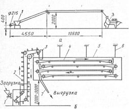 Рис. 117. Ленточные транспортеры для предварительной расстойки: а - однорядный; б - многоярусный.