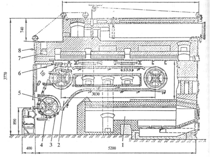 Рис. 139. Хлебопекарная печь ФТЛ-2 1- Топка 2- Пекарная камера 3- Цепной конвейер 4- Люльки 5- Чугунные блоки 6- Перфорированные трубы 7- Канал для удаления избытка пара 8- Шибер Горячие газы направляются из топки по нижнему кирпичному каналу, передающему тепло пекарной камере через свод и далее направляются в металлический радиатор, а затем по передним или задним стоякам поднимаются в каналы верхнего газохода. Для изменения направления потока газов установлены шиберы. При выпечке ржаного хлеба, когда необходимо создать высокую температуру в первой зоне пекарной камеры, перекрываются шиберы, и все газы направляются в каналы верхнего газохода. Цепной конвейер представляет собой две пластинчатые шарнирные цепи с шагом 140 мм. Между цепями подвешены люльки 4. Для выпечки формового хлеба в люльки вставляются секции из форм, а для подовых изделий применяются люльки с подиками из листовой стали с бортами с трех сторон. Всего в печи имеются 24 люльки шириной 1920 мм и длиной 350 мм. Приводная станция конвейера печи состоит из электродвигателя, редуктора, соединенного с двигателем ременной передачей. Продолжительность выпечки можно регулировать с помощью реле времени в пределах 10-100 мин. При загрузке печи и выгрузке изделий конвейер стоит. Продолжительность выпечки регулируют изменением продолжительности выстоя конвейера. Конвейер останавливается автоматически. Пар, для увлажнения тестовых заготовок, подводится в первую зону камеры по трубам 6 с отверстиями (перфорированным трубам). Пар вырабатывается в специальных парогенераторах или поступает из котельной. Посадка тестовых заготовок, выемка готовых изделий производятся через посадочное отверстие. Когда загорится сигнальная лампа реле. В печи ФТЛ-2 обмуровка топки, нижнего и вертикальных каналов выполнена из шамотного кирпича. Радиатор печи представляет собой широкую железную коробку прямоугольного сечения, нижняя стенка которой со стороны греющих газов выложена огнеупорными плитками толщиной до 35 мм. Производительность печи зависит от температурного режима, массы и наименования вырабатываемых изделий, количества изделий на люльке, и составляет от 7,1 до 15,3 т/сут.