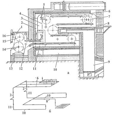 Рис. 140. Хлебопекарная печь ХПП-25: а - продольный разрез; б - схема движения газов В камере увлажнения расположены приводной 14 и направляющий 15 валы со звездочками. Конвейер приводится в движение от электродвигателя через червячный и цилиндрический редукторы, клиноременную, плоскоременную и цепную передачи к приводному валу. Продолжительность выпечки регулируется вариатором скорости. Из топки печи (рис. 140, б) газы поступают в центральный газоход подвесного канала 8. В конце канала газы разделяются на два параллельных потока, которые по двум боковым каналам опускаются в два нижних канала 10, а из них по двум стоякам 11 направляются в передние вертикальные газоходы 2, откуда по верхним каналам 6 под водогрейные котелки. Вертикальный газоход 2, отделенный от пекарной камеры металлической стенкой с малым термическим сопротивлением, создает в посадочной части пекарной камеры высокую температуру, т. е. зону обжарки, необходимую при выработке ржаных хлебных изделий. Однако при выработке хлебных изделий из пшеничной муки необходимо в этой зоне понизить температуру и повысить влажность. Для этого в вертикальных стояках боковых стен печи размещаются два парогенератора. Это снижает температуру газов, поступающих в канал 2, и уменьшает подачу тепла в пекарную камеру. Повышение влажности в этой зоне достигается подачей пара подрубам 5 (см. рис. 140, а). Пар в камеру увлажнения подается по двум трубам 16, а для опрыскивания водой готовых изделий предусмотрена труба 12 с форсунками, направленными вниз, в сторону проходящих под ними люлек Загрузка тестом форм и выгрузка готового хлеба производятся вручную. Выгрузка подовых изделий на ленточный транспортер 13 осуществляется автоматически при помощи упора, наклоняющего люльки на 30-45°.