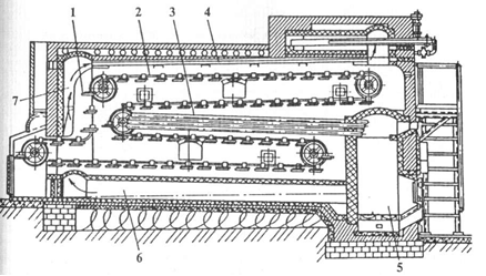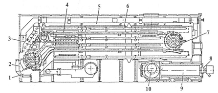 Печь ХПА-40 (рис. 142) имеет комбинированную систему обогрева, состоящую из пароводяных трубок и каналов. Печь оборудована четырехниточным цепным люлечным конвейером 2. К конвейеру подвешено 100 люлек 1 с шагом между подвесками люлек 280 мм. Конвейер приводится в движение через вариатор скорости, длительность выпечки можно регулировать от 40 до 65 мин. Два кирпичных канала 6 расположены внизу камеры, а девять дымогарных труб 4 диаметром 150 мм - под ее верхним перекрытием. В средней части камеры установлено 110 нагревательных трубок 3 в виде четырехрядного нагревательного пучка с уклоном 40 мм на 1 м.
