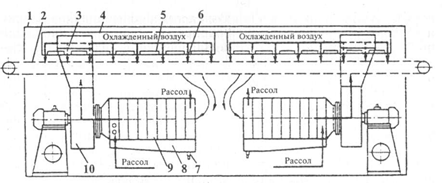 Охлаждающая камера с конвективно-радиационным теплообменом (рис. 200) представляет собой стальной каркас 1, внутри которого проходит конвейер 2 и установлены две автономные системы охлаждения и транспортирования воздуха. Система охлаждения состоит из воздухоохладителя 9, вентилятора 10, воздуховода 3 и распределительного короба 4.
