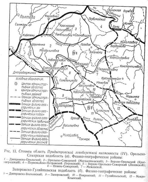 1. Днепровско-Орельский террасовый район занимает приднепровскую часть подобласти, которая простирается от нижнего течения р. Ворсклы до долины р. Самары. Характеризуется сочетанием долинных пойменных лугово-болотных, надпойменно-террасовых песчано-боровых и лессовых степных типов местностей. 2. Орельско-Самарский (Магдалиновский) район занимает водораздельное пространство между средним течением р. Орели и Самары Наиболее широко распространен водораздельно-равнинный тип местности с обыкновенными среднегумусными черноземами. Подчиненное место занимают долинно-балочный тип местности с эродированными обыкновенными черноземами и пойменный тип местности долины Орели и небольших приток Днепра—Самары и Орели. На правобережье р. Самары развит овражно-балочный тип местности (Вольное—Кочерижки)