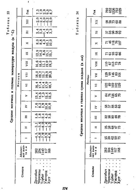На Закарпатской низменности годовая сумма радиационного баланса возрастает до 50 ккал/см2. Над Карпатами в средних слоях тропосферы господствует западный перенос воздушных масс. Общий режим циркуляционных процессов в нижних слоях тропосферы, который слагается под влиянием основных барических систем — Азорского и Сибирского максимумов, Исландской и Средиземноморской областей пониженного давления, резко нарушается барьерным воздействием гор. Прежде всего, горный барьер задерживает воздушные массы и изменяет их направление. При этом атлантические воздушные массы, приходящие с запада и северо-запада, двигаются почти параллельно горным сооружениям и слабо задерживаются. Наоборот, средиземноморские воздушные массы, приходящие с юго-запада, и арктические воздушные массы, приходящие с северо-востока, двигаются почти перпендикулярно к простиранию гор, поэтому барьерная роль гор возрастает. Горы усиливают активность циклонов, обусловливают развитие местной горно-долинной циркуляции. Вследствие этого Украинские Карпаты характеризуются четко выраженной высотной зональностью климата, значительным увеличением увлажнения и довольно сложным территориальным распредением климатических элементов. Для общего представления о климатических условиях отделы частей Украинских Карпат приведем данные многолетних метеорологических наблюдений по отдельным станциям (см. таблицы 33, 34). В Украинский Карпатах и их предгорьях М.С. Андрианов (1967) выделяет 6 вертикальных термических зон. 1. Теплая зона характеризуется суммой активных темпертур 2800—3100°. Средняя температура самого теплого месяца (июля) 19-20°, самого холодного (января) от —3 до —5°. Такие тепловые условия наблюдаются на Закарпатской низменности и частично по днищам предгорных долин, а также в Предкарпатье — к востоку от Черновиц. В пределах теплой зоны тепла достаточно для выращивания широкого ассортимента сельскохозяйственных культур, в том числе таких теплолюбивых как табак, виноград, рис. 2. Умеренно теплая зона имеет сумму активных температур 2200-2800°. Средняя температура июля 17—19°, января — от —4,5 до 5°. Зона занимает Предкарпатье и склоны Вулканического хребта в Закарпатье от 250 до 450—500 м высоты. В этой зоне обнаруживаются некоторые различия теплообеспеченности для развития сельскохозяйственных культур.