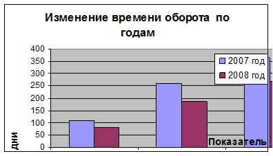 Из данных таблицы видно, что произошло увеличение оборачиваемости всех приведённых показателей. Оборачиваемость дебиторской задолженности увеличилась по сравнению с 2007 годом с 1,39 оборотов в год до 1,94 оборотов, то есть по сравнению с предыдущим годом погашение дебиторской задолженности происходило более быстрыми темпами, хотя эти показатели очень малы. Время оборота дебиторской задолженности составляет 259 дней в 2007 и 186 дней в 2008 году. Это говорит о том, что дебиторская задолженность погашается медленно. Изменение времени оборота по годам представлено на рисунке 2. Незначительно увеличилась оборачиваемость материальных оборотных средств с 3,3 оборотов в 2007 году до 4,4 оборотов в 2008 году. Соответственно время оборота уменьшилось до 82 дней. Увеличение оборачиваемости в 2008 году произошло за счёт повышения качества продукции, капитального ремонта и обновления основных средств производства.