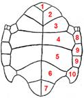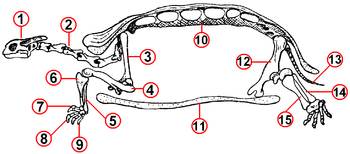 Скелет черепахи: 1 — череп; 2 — шейные позвонки; 3 — лопатка; 4 — плечевая кость; 5 — локтевая кость; 6 — лучевая кость; 7 — большой палец; 8 — средний палец; 9 — мизинец; 10 — туловищные позвонки, 11 — пластрон; 12 — таз; 13 — хвостовые позвонки; 14 — малоберцовая кость; 15 — большеберцовая кость Череп панцирного типа — псевдостегальный (у современных морских черепах) или с ложной височной дугой — псевдоапсидный (у остальных черепах). Челюсти современных черепах лишены зубов и покрыты роговыми пластинками в виде клюва. Шейный и хвостовой отделы позвоночника подвижны, остальные срослись с карапаксом. Из-за развития панциря пояса конечностей у черепах переместились под рёбра (уникальное явление среди позвоночных)[1]. Панцирь — наиболее характерный видимый признак черепахи, отличающий её от других рептилий. Он состоит из спинного щита — карапакса и брюшного — пластрона. Костная часть первого образована костными пластинками, сросшимися, как правило, с рёбрами и позвоночником. Второй у подавляющего большинства черепах образован грудиной, ключицами и брюшными рёбрами[5]. Сверху у большинства черепах панцирь покрыт симметричными роговыми щитками, и только у некоторых видов, таких как мягкотелые и кожистые черепахи, его покрывает плотная кожа[6]. Панцирь новорождённых черепах мягкий, но с возрастом он обычно твердеет[7]. На спинном щите выделяются шейный, позвоночные, боковые (рёберные) и один ряд краевых щитков (у древнейшей известной науке черепахи с полностью сформированным панцирем Proganochelys quenstedti был двойной ряд краевых щитков), на брюшном — горловой, межгорловые, плечевые, грудные, брюшные, бедренные, заднепроходные, подмышечные, паховые и межкраевые щитки. Каждый щиток растёт самостоятельно, и на нём вырастают концентрические годовые кольца. Спереди и сзади панцирь имеет отверстия, через которые черепаха выдвигает голову, хвост и конечности. У некоторых видов подвижные части панциря могут плотно закрывать оба отверстия (или одно из них) при опасности. У коробчатых черепах передняя и задняя доли пластрона плотно притягиваются к карапаксу, надёжно защищая туловище со всех сторон. У паучьей черепахи (Pyxis arachnoides) подвижна только передняя доля пластрона. Специфическое строение имеет панцирь африканских киникс, у которых подвижна задняя доля не пластрона, а карапакса[8]. Форма и вид панциря связана с образом жизни черепах: у сухопутных видов он чаще всего высокий, куполообразный, часто бугорчатый, у пресноводных — низкий, уплощённый и гладкий, у морских имеет обтекаемую каплевидную форму.