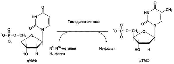 Скорость синтеза дТМФ зависит также от количества второго субстрата тимидилатсинтазной реакции - N5,N10-метилен-Н4-фолата, пополнение запасов которого осуществляется при участии 2 ферментов: дигидрофолатредуктазы, которая с участием NADPH восстанавливает Н2-фолат в Н4-фолат, и серии гидроксиметилтрансферазы, осуществляющей перенос β-гидроксиметиленовой группы серина на Н4-фолат. У человека дТМФ образуется, главным образом, из дЦДФ. Противоопухолевые препараты. Синтезировано очень много аналогов дНТФ, которые включаются ДНК полимеразами в ДНК и ингибируют репликацию. К числу мощных противоопухолевых препаратов принадлежит 5-фторурацил (5-FU) - аналог урацила.