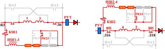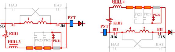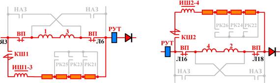 Увеличение скорости в режиме «ослабления поля». При переводе ГРКВ в Ход-3 включаются КШ1 и КШ2 и параллельно обмоткам возбуждения двигателей подключается цепь, состоящая из индуктивного шунта и реостата ослабления поля. С точки зрения электротехники это означает, что общее сопротивление в силовой цепи каждой группы двигателей уменьшается, так как общее сопротивление для двух параллельных цепей определяется по формуле: