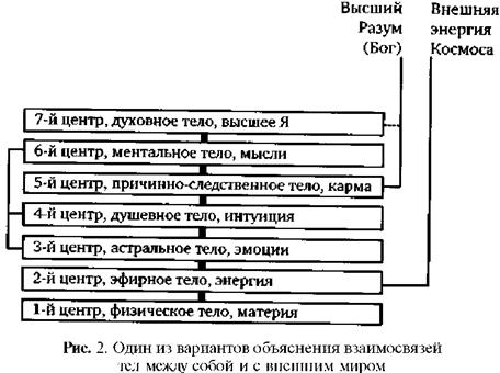 При здоровом, гармоничном развитии энергетических центров вполне возможна и такая ситуация: «По чем нанялись? Да семь дней работы, а спать про себя», «Макару поклон, а Макар на семь сторон». Но есть и предупреждение: «Семь раз отмерь, один отрежь» - то есть следует всегда соизмерять свои внутренние возможности с желаниями, заботами, работой, трудностями адаптации, потому что, как оказалось, можно только «семи-ться, казаться семью». Гораздо лучше, жизнеспособнее, когда в человеке, как говорится, «семь Симеонов, одна Матрена», то есть он живет, работает, чувствует себя как единое целое, как животворный, здоровый организм. До сих пор мы говорили о семи центрах энергии в организме человека, но следует знать, что энергия, не обладая формой, присущей стабильным телам, не может быть заключена в замкнутом объеме (центре). Энергии - поток, занимающий некое пространство. Поэтому вполне логично говорить об энергетических телах, которые обладают определенной плотностью в своих центрах, формируют энергетическое тело человека. В литературе часто называют эти семь тел, связанных с семью указанными центрами и образующих биополе человека как внутри тела, так и вне его. Общая терминология по названиям тел не устоялась (табл. 1), но ближе всего при расшифровке русских пословиц терминология Н. Левашова.