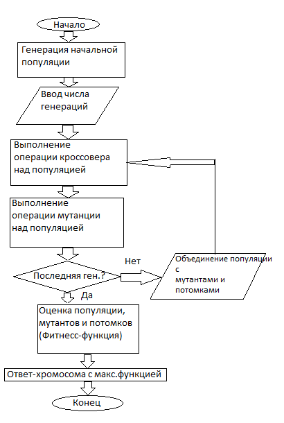 else if (st1 == chr_length - 1 && st2 == chr_length - 1) if (matr[P1[st1],P1[0]] < matr[P2[st2],P2[0]]) if (!O2.Contains(P1[0])) { a = P1[0]; O2[counter++] = a; for (int i = 0; i < chr_length; i++) if (P2[i] == a) st2 = i; } else if (!O2.Contains(P2[0])) { a = P2[0]; O2[counter++] = a; for (int i = 0; i < chr_length; i++) if (P1[i] == a) st1 = i; } else return; else if (!O2.Contains(P2[0])) { a = P2[0]; O2[counter++] = a; for (int i = 0; i < chr_length; i++) if (P1[i] == a) st1 = i; } else if (!O2.Contains(P1[0])) { matr[P1[st1],P1[0]] = 0; a = P1[0]; O2[counter++] = a; for (int i = 0; i < chr_length; i++) if (P2[i] == a) st2 = i; } else return; else if (st1 == chr_length - 1) if (matr[P1[st1],P1[0]] < matr[P2[st2],P2[st2 + 1]]) if (!O2.Contains(P1[0])) { a = P1[0]; O2[counter++] = a; for (int i = 0; i < chr_length; i++) if (P2[i] == a) st2 = i; } else if (!O2.Contains(P2[st2 + 1])) { a = P2[++st2]; O2[counter++] = a; for (int i = 0; i < chr_length; i++) if (P1[i] == a) st1 = i; } else return; else if (!O2.Contains(P2[st2 + 1])) { a = P2[++st2]; O2[counter++] = a; for (int i = 0; i < chr_length; i++) if (P1[i] == a) st1 = i; } else if (!O2.Contains(P1[0])) { matr[P1[st1],P2[0]] = 0; a = P1[0]; O2[counter++] = a; for (int i = 0; i < chr_length; i++) if (P2[i] == a) st2 = i; } else return; else if (matr[P1[st1],P1[st1 + 1]] < matr[P2[st2],P2[0]]) if (!O2.Contains(P1[st1 + 1])) { a = P1[++st1]; O2[counter++] = a; for (int i = 0; i < chr_length; i++) if (P2[i] == a) st2 = i; } else if (!O2.Contains(P2[0])) { a = P2[0]; O2[counter++] = a; for (int i = 0; i < chr_length; i++) if (P1[i] == a) st1 = i; } else return; else if (!O2.Contains(P2[0])) { a = P2[0]; O2[counter++] = a; for (int i = 0; i < chr_length; i++) if (P1[i] == a) st1 = i; } else if (!O2.Contains(P1[st1 + 1])) { matr[P1[st1],P1[st1 + 1]] = 0; a = P1[++st1]; O2[counter++] = a; for (int i = 0; i < chr_length; i++) if (P2[i] == a) st2 = i; } else return; string str = ""; for (int i = 0; i < chr_length; i++) str += O1[i]; lst.Add(str); } Мутация обмена private void Mutation(int[] P, List<string> lst) { Random rand = new Random(); int[] O = new int[P.Length]; for (int i = 0; i < chr_length; i++) O[i] = P[i]; int point = rand.Next(1, chr_length); if (point == chr_length - 1) { int q = O[point - 1]; O[point - 1] = P[point]; O[point] = q; } else { int q = O[point]; O[point] = O[point + 1]; O[point + 1] = q; } string str = ""; for (int i = 0; i < chr_length; i++) str += O[i]; lst.Add(str); }