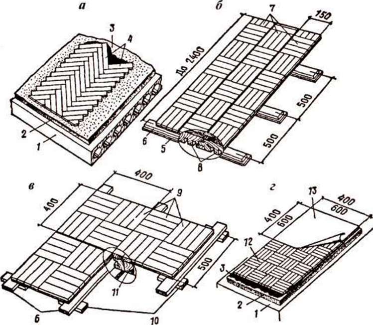 Продольные пропилы на тыльной стороне щита не допускают коробления паркетной доски и отслаивания наклеенной клепки. Полы из щитового паркета (рис. 3.33, в). Щиты размером 400 х 400 мм имеют реечное основание с наклеенной паркетной клепкой. Щиты укладывают по лагам, прибивая их гвоздями. Полы из мозаичного паркета (рис. 3.33, г). Мелкую паркетную клепку наклеивают лицевой стороной на плотную бумагу. Такие карты размером 400 х 400, 600 х 600 мм приклеивают к основанию битумной мастикой, затем с его лицевой стороны снимают бумажную основу.