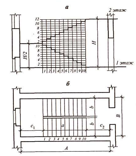 Лестницы гражданских зданий классифицируют: по назначению: основные для повседневного сообщения между этажами; вспомогательные для связи с подвалом или чердаком; служебные для обслуживания персонала столовых, магазинов и других общественных зданий; аварийные для эвакуации из зданий; пожарные, обеспечивающие выход на крышу; входные для входа в здание или отдельное помещение; по числу маршей: одномаршевые, двухмаршевые (рис. 3.56), трехмаршевые; по условиям пожарной безопасности: не защищенные от огня и дыма, защищенные от огня и дыма, т.е. размещенные в лестничных клетках; незадымляемые, т.е. связанные с помещениями многоэтажных зданий через балкон или лоджию. Лестница состоит из маршей и площадок. Лестничные площадки, расположенные в уровне пола этажа, называются этажными, а промежуточные по высоте этажа — междуэтажными. Лестничные марши имеют определенные названия: цокольный, междуэтажный, подвальный, чердачный. Марш представляет собой конструкцию, состоящую из ступеней, поддерживающих их косоуров (располагаемых под ступенями) или тетив (примыкаемых к ступеням сбоку). У ступеней вертикальную грань называют подступенком, а горизонтальную — проступью. Все ступени лестничного марша должны иметь одинаковую форму, кроме верхней и нижней, примыкающих к лестничной площадке, называемых фризовыми. Размещение лестниц в плане здания, их число и размер зависят от назначения, габаритов и компоновки здания с учетом обеспечения удобной эвакуации людей. Так, в гражданских зданиях должно быть не менее двух лестниц, а в жилых зданиях с числом этажей I0 и более — обеспечен выход из каждой квартиры на две лестницы непосредственно или через соединительный переход.