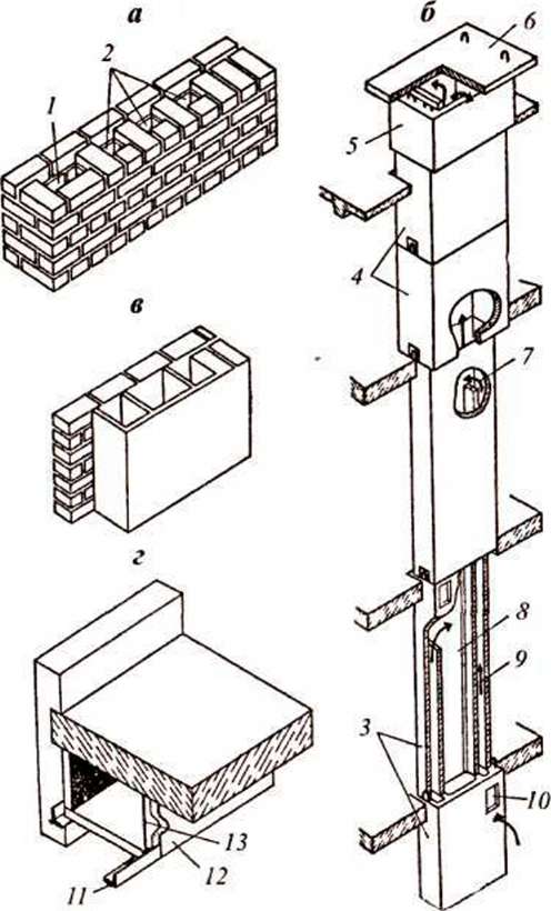 квартир и не допускать распространения запахов. Объединение каналов допускается в соответствии с санитарными нормами через несколько этажей. На чердаке каналы объединяют в вытяжную шахту и выводят над крышей (рис. 4.17). Дымовые каналы размещают втрубах или во внутренних кирпичных стенах. Их сечение для печей — 0,5 х 0,5 кирпича. Для улучшения тяги внутреннюю поверхность дымохода затирают глиняным раствором.