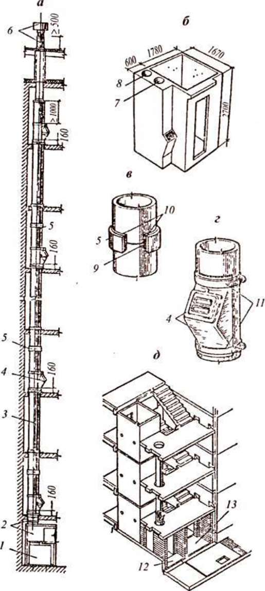 Мусоропроводы устраивают в жилых зданиях высотой 5 этажей и более. Мусоропроводную камеру располагают в подвале или на первом этаже и оборудуют водопроводом и канализацией. Вход в камеру должен быть самостоятельным, изолированным от входа в здание. Состоит мусоропровод из вертикального ствола, имеющего приемные камеры на каждом этаже; вытяжныхтруб; мусоропровод- ного бункера, расположенного в камере. Вертикатьный ствол выполняют из асбестоцементных труб (рис. 4.18). (. - 4735