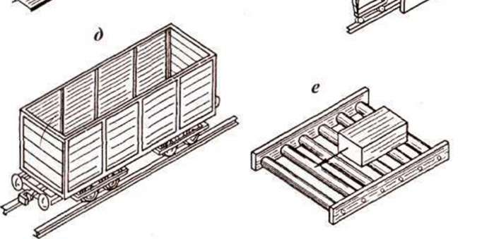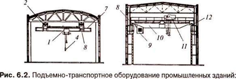 Технико-экономические показатели По — общая земельная площадь, м2; Пз — площадь всех зданий, м2; Пч — площадь дорог и тротуаров, м2; X", — коэффициент плошали застройки, %: к\ = П3/По* 100%; К2 — коэффициент использования территории, %: *2=П3+Пд/П0х 100%; О — строительный объем здания по наружной грани стены, м3; 0 = £х Н, где 5— площадь здания по наружной грани стены, м; Н — высота здания, м. Раздел В. КОНСТРУКЦИИ ПРОМЫШЛЕННЫХ ЗДАНИЙ Тема 6.1. Классификация и конструктивные системы промышленных зданий Здания, предназначенные для размещения промышленных производств, называют промышленными. Промышленные здания классифицируют по следующим признакам: • по этажности: одноэтажные; многоэтажные; по назначению: производственные (основные и вспомогательные); энергетические (ТЭЦ, котельные, трансформаторные подстанции); транспортно-складские (гаражи, склады, локомотивное депо); административно-хозяйственные и бытовые (инженерные, лабораторные корпуса, поликлиники); сантехнические для обслуживания водопроводов и канализации (насосные, водонапорные башни); • по материалу конструкций каркаса: стальные; железобетонные; комбинированные (смешанные); по огнестойкости: для зданий I класса не менее II степени; для зданий II класса не менее III степени; для зданий III и IVклассов степень огнестойкости не нормируется. Промышленные здания должны удовлетворять общим требованиям (функциональным, техническим, противопожарным, индустриальным, архитектурно-художественным), атакже ряду специальных требований, обусловленных характером производства: • объемно-планировочные и конструктивные решения здания должны обеспечивать наилучшие условия для организации производственного процесса и размещения оборудования; пространственная жесткость здания должна быть обеспечена с учетом воздействия вертикальных и горизонтальных динамических нагрузок, вызываемых работой технологического и подъемно-транспортного оборудования; • должны быть разработаны мероприятия для сохранения здоровья рабочих и обеспечения их безопасности; • должны быть разработаны мероприятия по предотвращению износа здания. Для перемещения сырья, полуфабрикатов, готовой продукции промышленные здания оснащают разнообразными видами подъемно-транспортного оборудования, включающего: • экипажное оборудование (рис. 6.1, а—д) (автокары, автопогрузчики, подвижной состав узкой (950 мм) и ширококолейной (1524 мм) железной дороги, ручные тележки, козловые краны, движущиеся по рельсам, уложенным на земле); оборудование станинного типа (рис. 6.1, в, е) (конвейеры, элеваторы, транспортеры, грузовые подъемники, рольганги); • а б