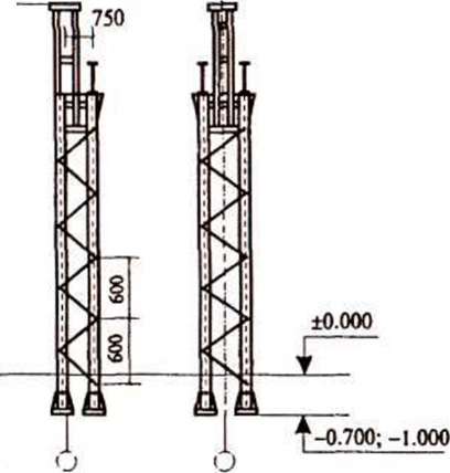 Колонны постоянного сечения представляют собой прокатные сварные двутавры с консолями для опирания подкрановых балок. Их устанавливают в бескрановых или крановых зданиях высотой К,4-9,6 м (при грузоподъемности кранов до 20 т). Привязка крайних колонн: при Я = 6-8,4 м — нулевая; при И = 8,4-9,6 м — 250 мм. Расстояние от уровня пола до верха подколонника 600 мм (для колонн Н— 8,4-9,6 м), 200 мм (для колонн Н = 6-8,4 м). Ступенчатые (двухветвевые) колонны предназначены для зданий с высотой этажа 9,6—18 м, оборудованных кранами грузоподъемностью до 125 т. Налкрановая часть колонны (шейка) выполняется и» сварного двутавра, подкрановая состоит из двух ветвей, соединенных решеткой. Подкрановую часть двухветвевых колонн выполняют из прокатных швеллеров и двутавров (при высоте сечения до 400 мм), из гнутых швеллеров и двутавров сварных или прокатных (при высоте сечения 400—650 мм). Башмаки стальных колонн крепят к анкерным болтам, заделанным в железобетонный фундамент. Опирание осуществляют через слой цементно-песчаного раствора или бетона на мелком заполнителе. Конструкция башмака зависит от сечения колонны, характера нагрузки (центральная, внецентренная). Башмаки колонн сплошных и решетчатых (при небольшом расстоянии между ветвями) имеют общую базу. В зависимости от высоты траверсы нижний торец колонны располагают на отметке 0,6—0,9 м. Заглубленную часть колонны для защиты от коррозии бетонируют.