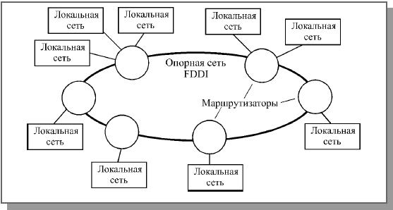 Кроме того, список всех доступных маршрутизаторов должен быть у каждого абонента сети. Именно маршрутизаторы чаще всего используются для связи локальных сетей с глобальными, в частности, с Интернет, которая может рассматриваться как полностью маршрутизируемая сеть. Преобразовать протоколы локальных сетей в протоколы глобальных сетей для маршрутизатора вполне по силам. Маршрутизаторы часто применяются для объединения опорной (стержневой) сетью типа FDDI множества локальных сетей (рис. 13.12) или для связи локальных сетей разных типов. Преобразование формата пакетов, требуемое в данной ситуации, для маршрутизатора не представляет никакой сложности. Например, большие пакеты сети FDDI могут разбиваться (фрагментироваться) на несколько меньших пакетов Ethernet.