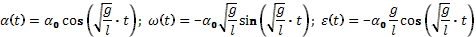 14.85. Математический маятник имеет длину нити l. Груз с нитью отклонили от вертикали на малый угол α0 и в момент t = 0 без начальной скорости отпустили. Написать зависимости от времени: угла отклонения нити α(t), угловой скорости ω(t) и углового ускорения ε(t) нити.