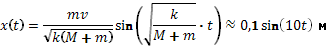 14.108. Брусок массой М = 2 кг лежит на гладкой горизонтальной поверхности и соединен с вертикальной стенкой горизонтальной пружиной жесткости k = 2 Н/см. Пуля массой m = 10 г, летящая горизонтально вдоль пружины со скоростью v = 200 м/с, попадает в брусок и застревает в нем. Написать уравнение x(t) возникших колебаний. Положение равновесия принять за x = 0.
