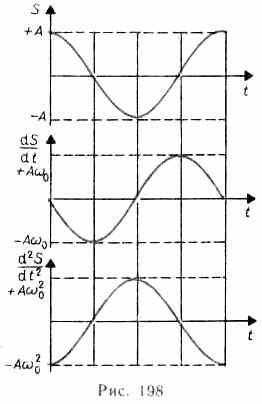 т. е. имеем гармонические колебания с той же циклической частотой. Амплитуды величин (140.4) и (140.5) соответственно равны А w0 и A w20. Фаза скорости (140.4) отличается от фазы величины (140.1) на π/2, а фаза ускорения (140.5) отличается от фазы величины (140.1) на p. Следовательно, в моменты времени, когда s=0, ds/dt приобретает наибольшие значения; когда же s достигает максимального отрицательного значения, то d2s/dt2 приобретает наибольшее положительное значение (рис. 198). Из выражения (140.5) следует дифференциальное уравнение гармонических колебаний d2s/dt2+w20s=0 (140.6) (где учтено, что s=A cos(w0t+j)). Решением этого уравнения является выражение (140.1).
