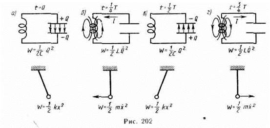 так как она на нагревание не расходуется. Поэтому в момент t= 1/4 Т, когда конденсатор полностью разрядится, энергия электрического поля обращается в нуль, а энергия магнитного поля (а следовательно, и ток) достигает наибольшего значения (рис. 202, б). Начиная с этого момента ток в контуре будет убывать; следовательно, начнет ослабевать магнитное поле катушки, и в ней индуцируется ток, который течет (согласно правилу Ленца) в том же направлении, что и ток разрядки конденсатора. Конденсатор начнет перезаряжаться, возникнет электрическое поле, стремящееся ослабить ток, который в конце концов обратится в нуль, а заряд на обкладках конденсатора достигнет максимума (рис. 202, в). Далее те же процессы начнут протекать в обратном направлении (рис. 202, г) и система к моменту времени t=T придет в первоначальное состояние (рис. 202, а). После этого начнется повторение рассмотренного цикла разрядки и зарядки конденсатора. Если бы потерь энергии не было, то в контуре совершались бы периодические незатухающие колебания, т. е. периодически изменялись (колебались) бы заряд Q на обкладках конденсатора, напряжение U на конденсаторе и сила тока I, текущего через катушку индуктивности. Следовательно, в контуре возникают электрические колебания, при чем колебания сопровождаются превращениями энергий электрического и магнитного полей. Электрические колебания в колебательном контуре можно сопоставить с механическими колебаниями маятника (рис.202 внизу), сопровождающимися взаимными превращениями потенциальной и кинетической энергий маятника. В данном случае энергия электрического поля конденсатора (Q2/(2C)) аналогична потенциальной энергии упругой деформа-