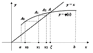 Как мы видим, эта теорема ставит довольно жесткие условия, которые необходимо проверить перед применением метода итераций. Если производная функции φ(x) по модулю больше единицы, то процесс итераций расходится (рис.2.5).
