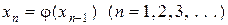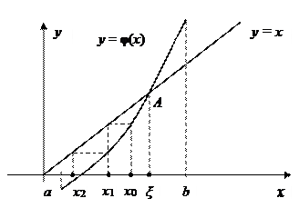 На рис. 2.4 показан процесс получения очередного приближения по методу итераций. Последовательность приближений сходится к корню ξ. Теоретические основы для применения метода итераций дает следующая теорема [7] Теорема 2.3. Пусть выполняются условия: 1) корень уравнения x = φ(x) принадлежит отрезку [ a, b ]; 2) все значения функции φ(x) принадлежат отрезку [ a, b ], т.е. a ≤ φ(x) ≤ b; 3) существует такое положительное число q < 1, что производная Тогда: 1. Итерационная последовательность 2. Предел итерационной последовательности является корнем уравнения 3. Справедливо неравенство, характеризующее скорость сходимости итерационной последовательности