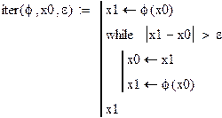 В качестве условия сходимости итерационных методов часто используется неравенство | xk – xk– 1| ≤ ε. (2.5) По этому критерию приближенным значением с точностью ε = 0,001 является x 5 = 0,244707 ≈ 0,245. Приведем текст программы-функции iter для решения уравнения методом итераций в программе Mathcad и результат вычисления корня: