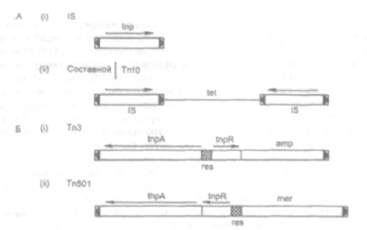 Рис. 73. Классы бактериальных транспозонов: А — инсерционный элемент (IS) (i); составной транспозон (ii) — (Tn10); Б — Tn3 и Tn501 — транспозоны семейства Tn3. Стрелки на концах транспозонов — короткие инвертированные последовательности, узнаваемые ферментом траспозазой (ген tpn). tet, amp и mer — гены в составе транспозонов, кодирующие резистентность к тетрациклину, ампициллину и солям ртути соответственно.