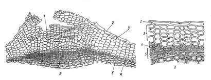 Рис. 3.3. Строение вторичной покровной ткани. Перидерма стебля бузины (Sambucus racemosa): А- чечивичка; Б- участок перидермы: 1- выполняющая ткань, 2- остатки эпидермы, 3- пробка (феллема), 4- пробковый камбий (феллоген), 5- феллодерма ТЕМА: ОСНОВНЫЕ, МЕХАНИЧЕСКИЕ, ВЫДЕЛИТЕЛЬНЫЕ ТКАНИ 1. Основные ткани и собенности их строения. 1.1. Запасающая паренхима 1.2. Фотосинтезирующая паренхима 2. Механические ткани и собенности их строения 2.1. Колленхима 2.2. Склеренхима 2.3. Склереиды 3. Выделительные ткани и собенности их строения 3.1. Ткани внутренней секреции 3.2. Ткани наружной секреции. Оборудование: Микроскопы: МБР-1, лупы, лезвия, вода, стёкла предметные и покровные, препаровальные иглы. Таблицы: "Растительные ткани", "Механические ткани", "Паренхимные ткани", "Выделительные ткани". Постоянные микроперапараты листа петрушки (Petroselinum sativa), живой материал: лист толстянки (Crassula ovata), черешок листа свёклы, стебель герани, плод груши, клубень картофеля, кожура апельсина.