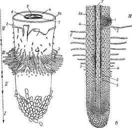 Рис. 7.1. Схемы строения кончика корня А- обший вид. Б- продольный срез кончика корня I - корневой чехлик; II-зона роста и растяжения: III - зона корневых волосков, или зона всасывания; IV- зоны проведения (и дифференциации боковых корней): 1 - заложение бокового корня 2 - корневые волоски на эпиблеме, 3 - эпиблема 3а - экзодерма 4 - первичная кора, 5 - эндодерма 6 - перицикл 7 - осевой цилиндр